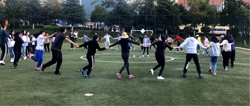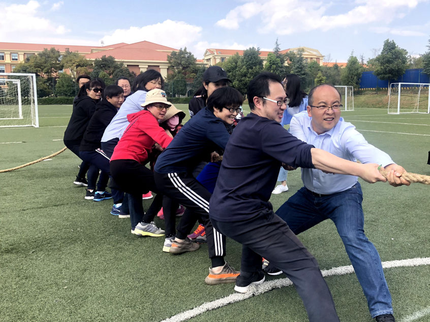 在工会主席杨恒芬老师以及副院长罗美娟老师的简短发言后,趣味运动会正式拉开了序幕。第一个比赛项目是携足并进,教师队和学生队各自用绳子绑到一起进行接力比赛,用时最少的队伍获胜.第二个项目是过河搭桥,要求每个人站在一块纸板上,双脚不能离开纸板,先到达终点的队伍获胜,这个比赛虽然难度较大,但是在老师和学生相互默契配合下,比赛顺利完成。第三个比赛项目是师生友谊拔河比赛,三局两胜制。随着裁判的一声令下,师生两边共同发力,第一场教师队一鼓作气,获得了第一轮的胜利,第二场学生队厚积薄发,将比分追平,在关键的第三场里场下的同学们为两边的队员鼓劲加油,老师组最终取得了最后的胜利。三个比赛教师队都体现出了惊人的默契和体力,在三场比赛中无论是时间还是完成度都远超过学生队,三场比赛过后教师队积分最高,获得了最终的胜利。