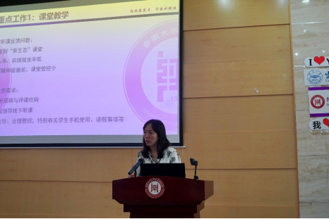 接下来,赵斌副教授代表督导组,就过去一周对43门课程的听课情况做出了具体说明。赵斌副教授一方面对本科课堂教学的督导过程中展现出的优点予以肯定,包括整体教学效果有所提高,课堂互动更加积极、教学流程把控程度提升;另一方面也对本轮听课中暴露出的问题予以指正,提倡使用层次分明、逻辑清晰的板书,进一步加强与学生的互动,鼓励教师之间相互听课、相互学习。